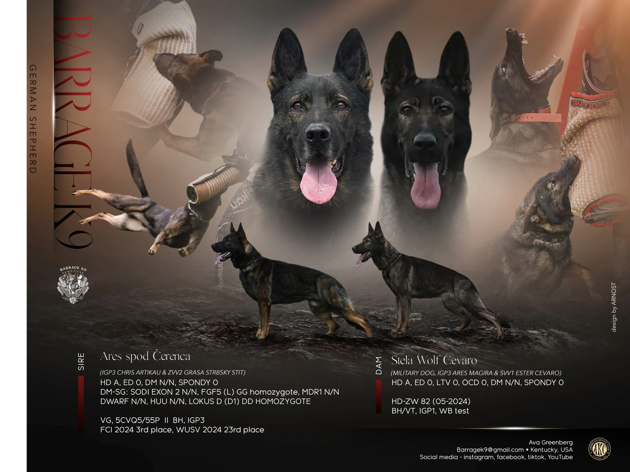 Ares Spod Čerenca is a top-tier competitor and proven sire in the working dog world. In 2024, he placed third at the FCI International Championship in Croatia, earning Best Overall Protection, and followed it up with a 23rd place finish at the WUSV in Meppen, Germany, out of 150 dogs.